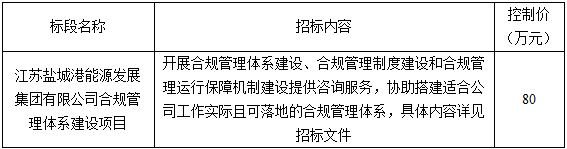 1.項目標段劃分:江蘇鹽城港能源發展集團有限公司合規管理體系建設項目共劃分1個標段,標段信息如下: