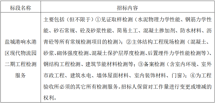 8、項(xiàng)目標(biāo)段劃分:鹽城港響水港區(qū)現(xiàn)代物流園二期工程檢測(cè)服務(wù)共為1個(gè)標(biāo)段,標(biāo)段信息如下: