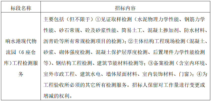 8、項目標段劃分:響水港現(xiàn)代物流園(6座倉庫)工程檢測服務(wù)共為1個標段,標段信息如下: