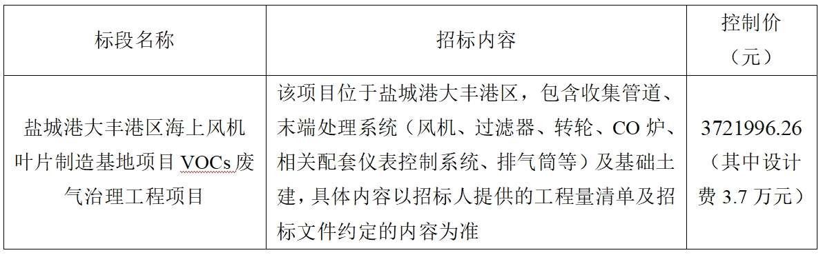 (1)項(xiàng)目名稱:鹽城港大豐港區(qū)海上風(fēng)機(jī)葉片制造基地項(xiàng)目VOCs廢氣治理工程項(xiàng)目。