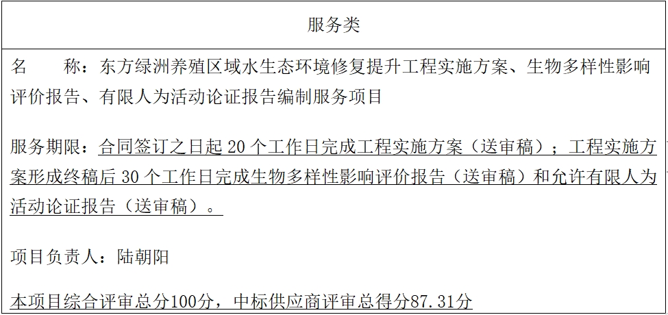 二、項目名稱:東方綠洲養殖區域水生態環境修復提升工程實施方案、生物多樣性影響評價報告、有限人為活動論證報告編制服務項目