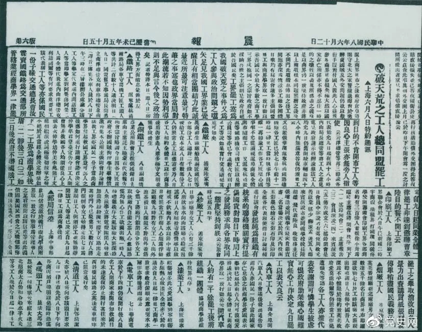 1919年6月3日以后,上海工人率先罷工,使五四愛國運動進入新的階段。圖為北京《晨報》關于上海六、七萬工人總同盟罷工的報道。