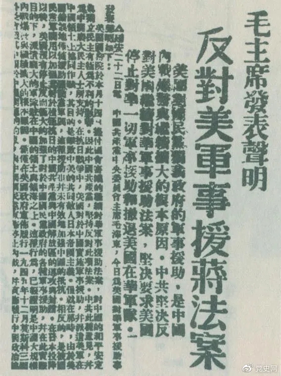 毛澤東以中共中央主席名義發表《反對美國對蔣軍事援助法案的聲明》。聲明指出:美國國務院于本月十四日提付國會審議的繼續對華軍事援助法案,對中國的和平安定與獨立民主有極為不利的影響,因此中國共產黨堅決反對此項法案。中共此種意見,并為中國廣大民主人士所支持。在抗日戰爭中,美國對于中國實施軍事援助,并派遣美軍在中國領土上協同作戰,其目的是擊敗中美的共同敵人日本帝國主義,但就在那時,由于美國錯誤地僅僅援助國民黨軍閥,這種援助也并未有效地加強中國的抵抗,相反地是被國民黨軍閥用以加強其對于積極抗日的中國共產黨與中國解放區的進攻與封鎖。在日本投降以后,美國沒有停止反而極大地加強了對于中國國民黨政府的各種軍事援助,并在此實際目的下派遣龐大的軍隊駐在中國的領土與領海之上,這種行動已經證明是中國大規模內戰爆發與繼續擴大的根本原因。美國實行所謂軍事援助,實際上只是武裝干涉中國內政,只是以強力支持國民黨獨裁政府繼續陷中國于內戰、分裂、混亂、恐怖和貧困,只是使中國不能實現整軍復員和履行其對于聯合國的義務,只是危害中國國家安全獨立與領土主權完整,只是破壞中美兩大民族的光榮友誼與中美貿易的發展前途。在此種現實情況之下,中國共產黨不得不堅決反對美國政府繼續以出售、交換、租借、贈送或讓渡等方式將軍火交給中國的國民黨獨裁政府,堅決反對美國派遣軍事使團來華,并堅決要求美國立即停止與收回對華的一切所謂軍事援助,和立即撤回在華的美國軍隊。