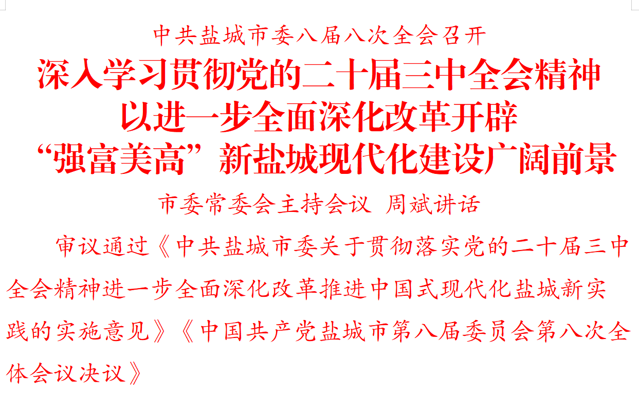 全會(huì)審議通過(guò)《中共鹽城市委關(guān)于貫徹落實(shí)黨的二十屆三中全會(huì)精神進(jìn)一步全面深化改革推進(jìn)中國(guó)式現(xiàn)代化鹽城新實(shí)踐的實(shí)施意見(jiàn)》《中國(guó)共產(chǎn)黨鹽城市第八屆委員會(huì)第八次全體會(huì)議決議》。
