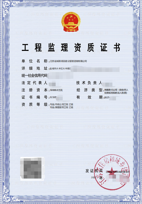 2022年11月18日,項目管理公司獲得由江蘇省住房和城鄉(xiāng)建設(shè)廳頒發(fā)的“房屋建筑工程乙級和市政公用工程乙級”兩項工程監(jiān)理資質(zhì)證書,標(biāo)志著公司資質(zhì)申辦工作取得重大進(jìn)展,對提升公司品牌影響力,提高市場競爭力具有重要的意義。