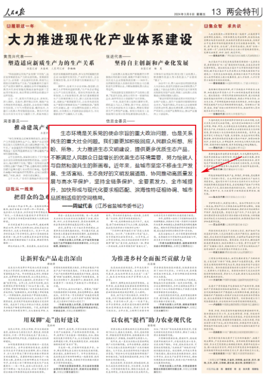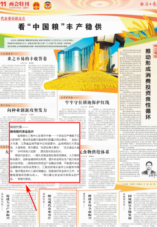 “鹽城是長三角中心區(qū)城市中唯一一個農(nóng)業(yè)總產(chǎn)值超千億元的城市,穩(wěn)住農(nóng)業(yè)基本盤是我們的重大政治責(zé)任。”全國人大代表、江蘇省鹽城市委書記周斌表示,鹽城將踐行大農(nóng)業(yè)觀、大食物觀,努力建設(shè)“東部沿海大糧倉”“生態(tài)食品大超市”“鄉(xiāng)村休閑大花園”,擦亮現(xiàn)代農(nóng)業(yè)名片。